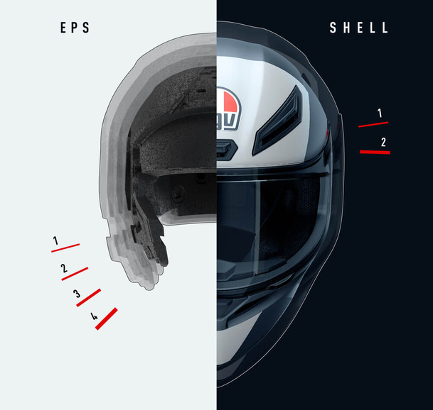 Kabuk yüksek dirençli termoplastik malzemeden yapılmıştır. Her türlü darbeye karşı maksimum koruma sağlamak için çok yoğunluklu EPS'den yapılmış 2 boyutlu dış kabuk ve 4 boyutlu iç kabuk.